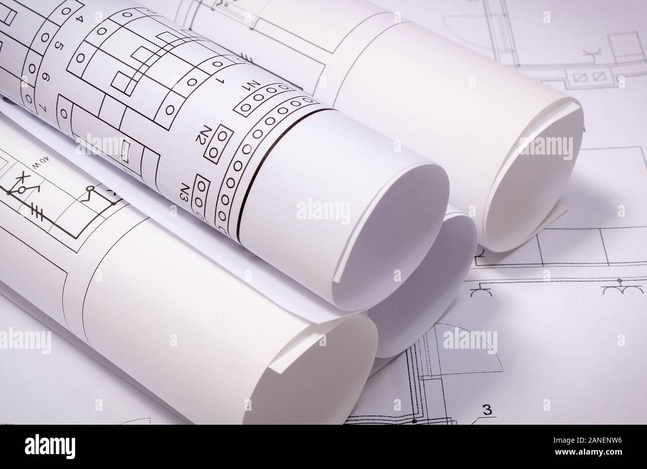 Rolled Electrical Diagrams On Construction Drawing Of House Drawings For Engineer Jobs Stock Photo Alamy