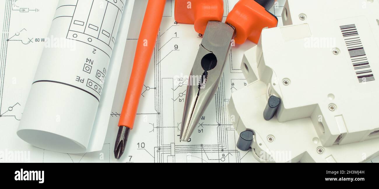 Electrical Diagrams Electric Fuse And Work Tools On Construction Drawing Of House Drawings For Projects Engineer Jobs Stock Photo Alamy